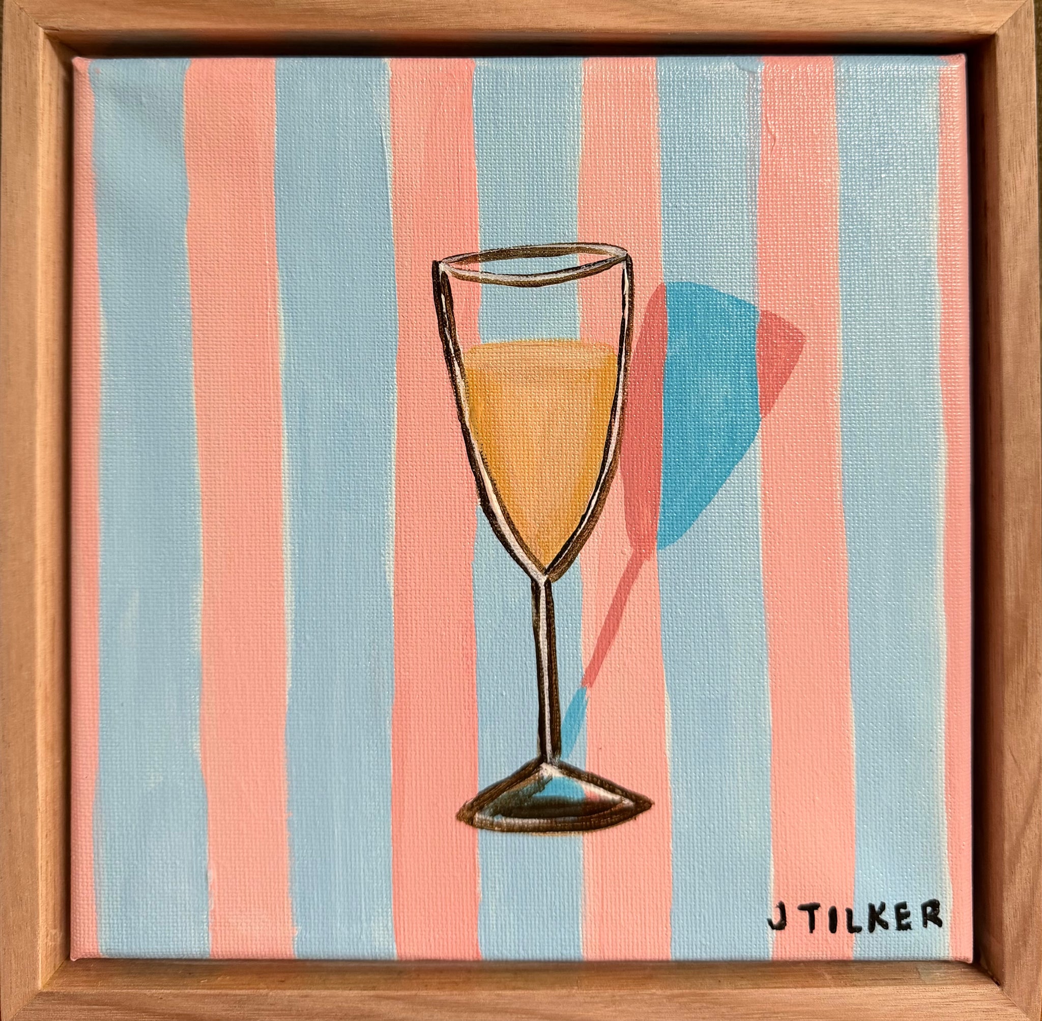Mini painting of a single glass of bubbles on pink and blue stripes.