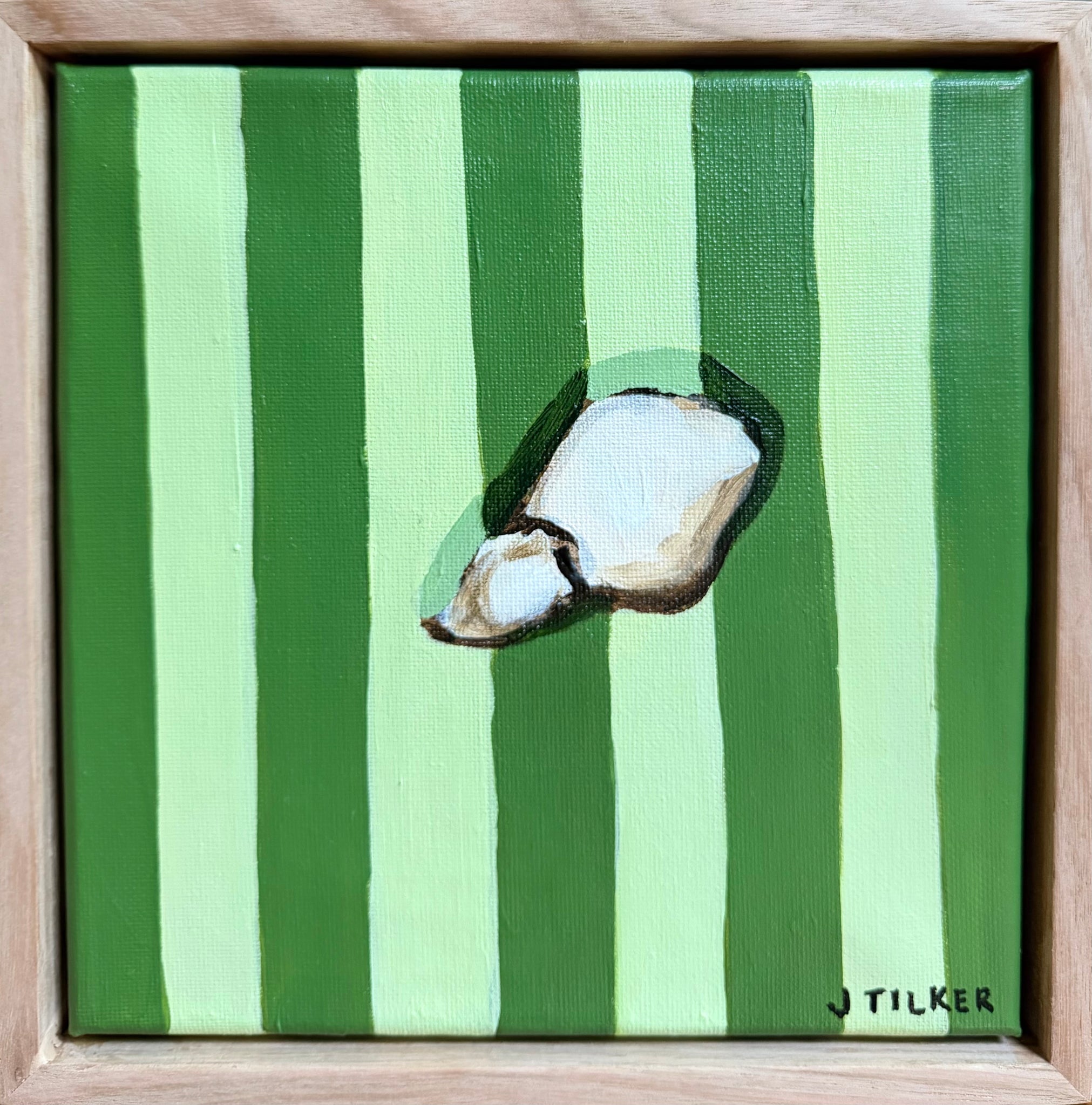 Mini painting of a single oyster on dark and light green stripes.